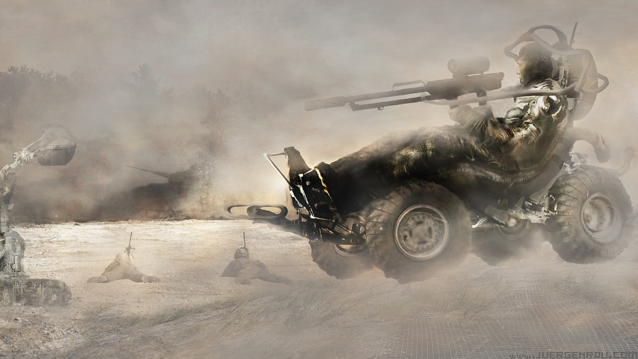 Concept car. Motorcycle (bike steering on two chains like a tank). Spaceship. Costume. 2D.