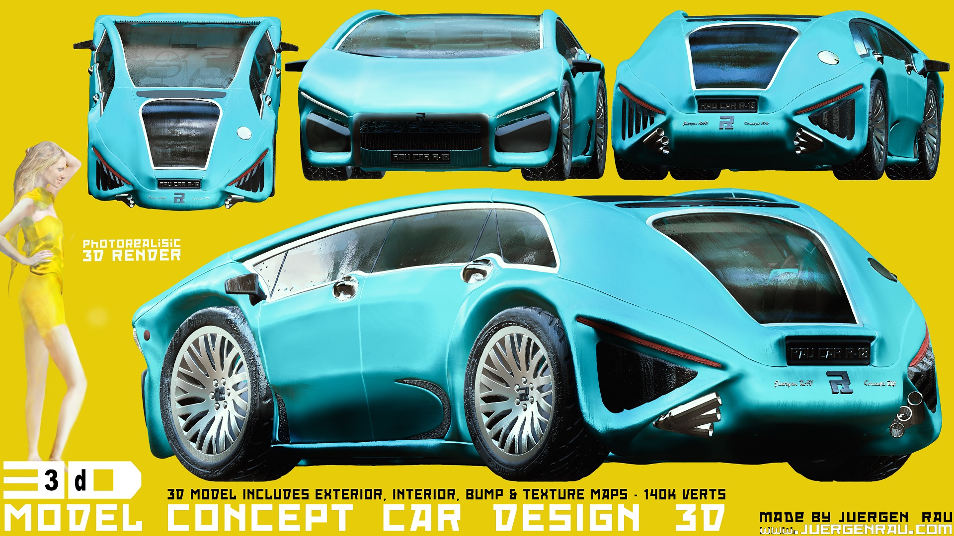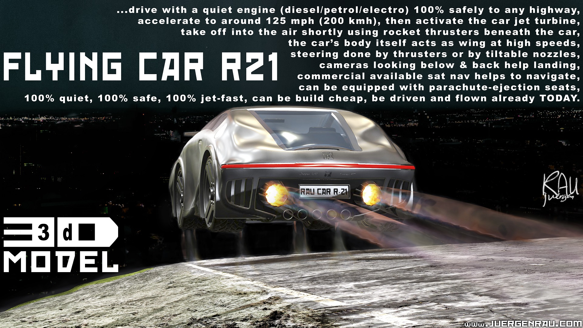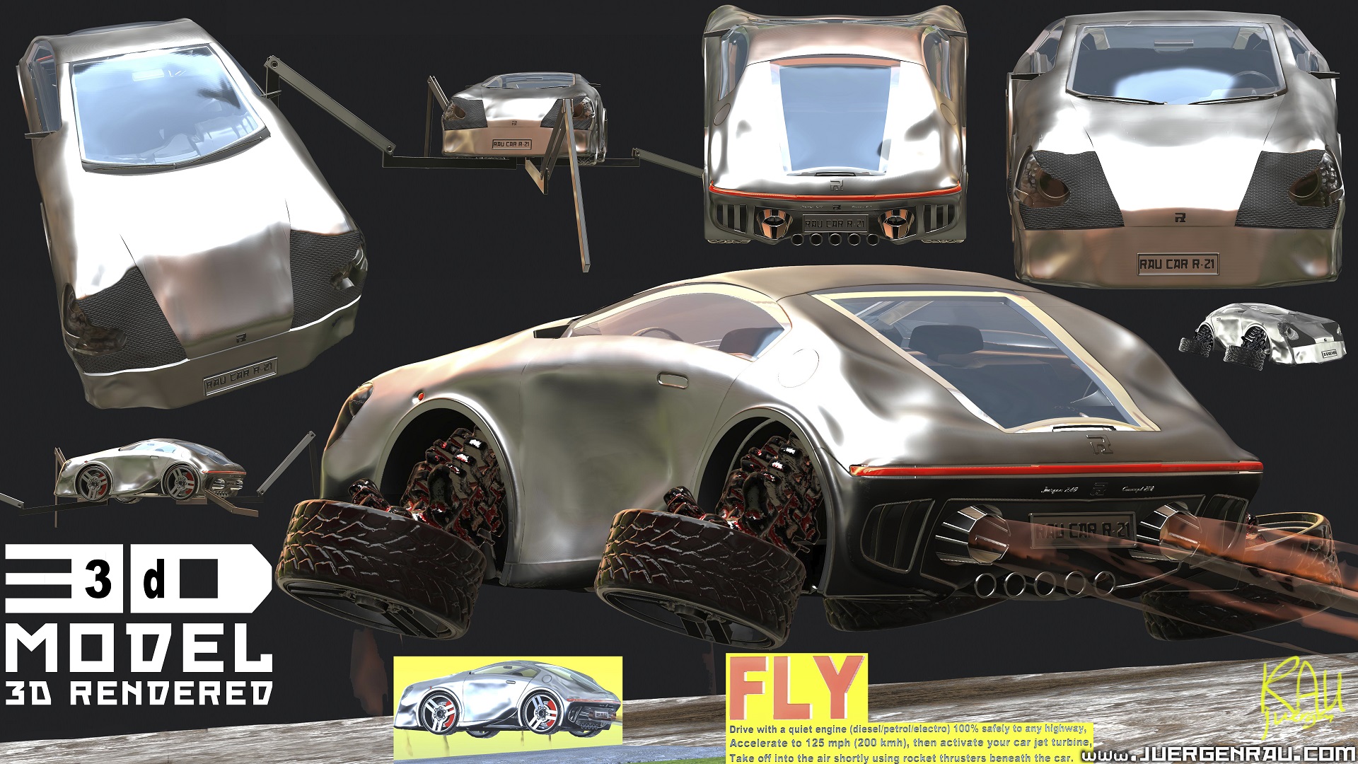 DESIGN IDEAS:Hundreds of other concept works are not included here due to strict privacy concerns in contracts of customer companies. All concepts listed below are originally made mainly by designing 3D CAD/Polygon model objects such as car/spaceship 3D concepts. The resolution size of the illustrations showing the concept is originally 7680x4320 pixels (4 Full-HD monitors in length and height). Click on the images to view them in a gallery (shown here at HD 1280x720 pixels and FHD 1920x1080 pixels resolution). This concepts gallery should include more pictures than in the portfolio gallery (some works from here are listed also once more in the portfolio). 3D CAD and SubD-Poly models are mainly shown here as illustration artworks. The newest concepts are shown first. The works here include such content as photorealistic human and alien characters, creatures, interior and exterior environments, props, day and night moods, production and project works, color comps, covers and posters, similar works as set, concept cars, vehicles, well thought-out spaceships, detailed suits, apocalyptic abandoned places, sexy clothes, UFOs, industrial and ancient buildings, rooms, fantasy conan-style barbarians, mechas, robots etc. CONCEPT WORKS (art selection):Concept Car R21 Schowcase